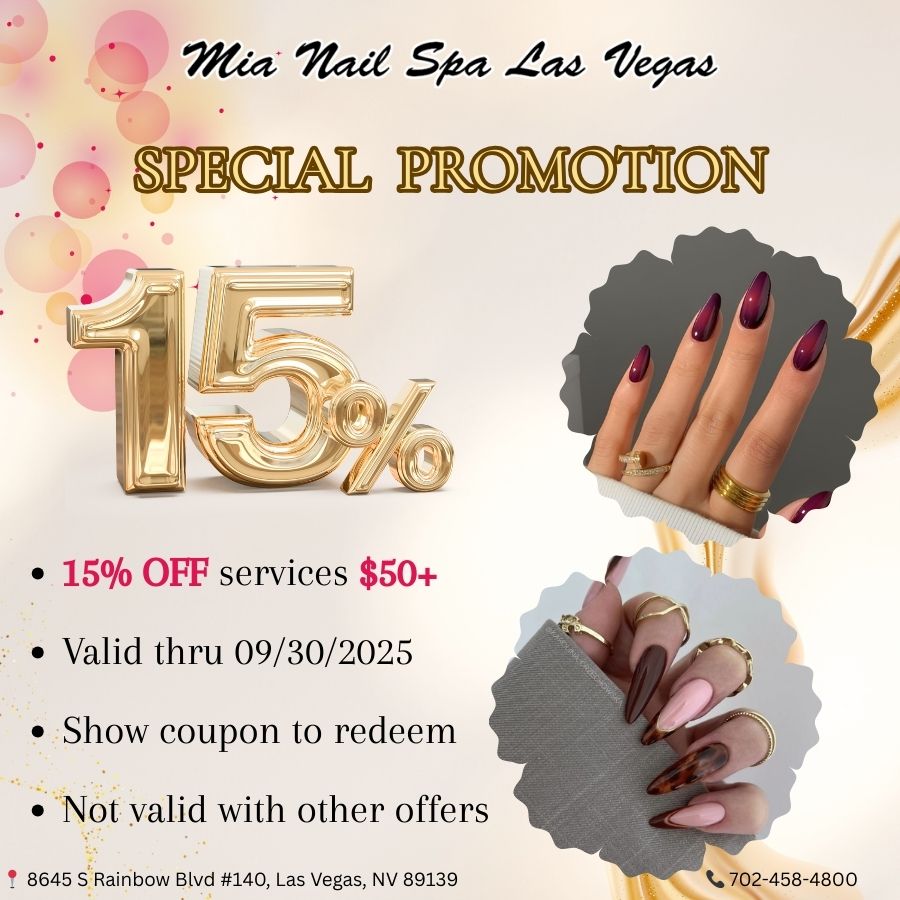 Mia Nail Spa Las Vegas guarantees to provide the top-high quality services that are implemented by professional and talented technicians. Come to visit us, you are to enjoy full nail care and spa services with the highest quality of work and standards. We want to make sure that when you come to our salon, you will have a pleasant experience.